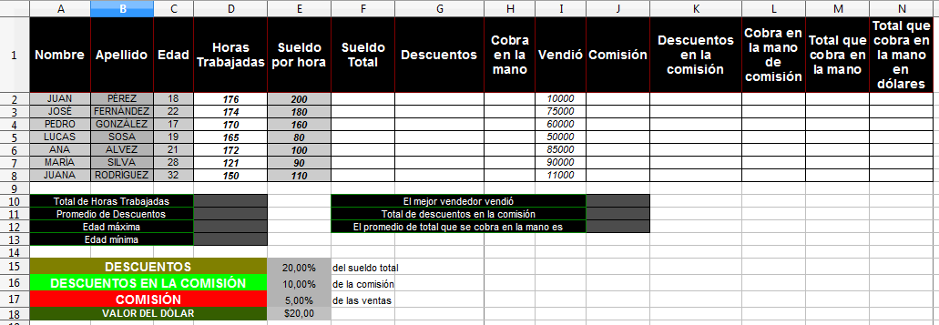 Práctica Parte 1: Resolver tabla - Resolver columna F sabiendo que: Sueldo Total = Horas Trabajadas * Sueldo por Hora - Resolver columna G sabiendo que: Descuento = Sueldo Total * Celda de Descuento - Resolver columna H sabiendo que: Cobra en la mano = Sueldo Total - Descuento - Resolver columna J sabiendo que: Comisión = Lo que vendió * Celda de Comisión - Resolver columna K sabiendo que: Descuentos en la comisión = Comisión * Celda de Descuentos en la Comisión - Resolver columna L sabiendo que: Cobra en la mano de Comisión = Comisión - Descuentos en la comisión - Resolver columna M sabiendo que: Total que cobra en la mano = Cobra en la mano + Cobra en la mano de Comisión - Resolver columna N sabiendo que: Total que cobra en la mano en Dólares = Total que cobra en la mano / Valor del Dólar Parte 2: Aplicar Formato Monetario a las Celdas que incluyen Dinero. - Aplicar el formato de Pesos Uruguayos (con signo $) a todas las columnas que son en pesos uruguayos. - Aplicar el formato de Dólares (con signo USD) a la columna N. Parte 3: Resolver las Filas 10 a 13 usando las funciones SUMA, PROMEDIO, MÁX, MÍN. - Las funciones se usan escribiendo signo de igual, el nombre de la función y entre paréntesis el rango para el cálculo - Por ejemplo, para la celda D10 el cálculo es =SUMA(d2:d8) Ticket de Salida Guardar el trabajo en la carpeta Calc con el nombre 04-trabajo.ods Subir aquí individualmente 04-trabajo.ods Actividad Extra Continuar o empezar la presentación en Impress tutorial.odp. Crear una diapositiva de presentación (si aún no lo has hecho) que tenga la imagen del logo de Calc y un Fontwork que diga TUTORIAL DE CALC Agregar una diapositiva por cada palabra clave (BIG WORDS). Si te quedan BIG WORDS pendientes de clases anteriores continúa con ellas y luego haces las de la clase de hoy. Recuerda en cada diapositiva utilizar uno o más cuadros de texto, un fontwork como título y una imagen, de manera de explicar la palabra clave. Recuerda agregar fondos diferentes, formatos de texto, links a páginas en internet que explican la palabra clave, transiciones y animaciones. Guardar el trabajo en la carpeta Calc con el nombre tutorial.odp Subir aquí individualmente tutorial.odp |